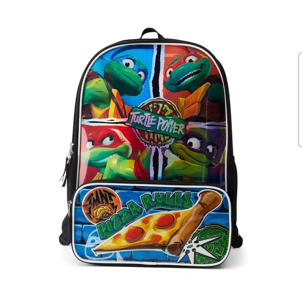 Mochila para niños Nickelodeon Ninja Turtle de 17". Esta mochila cuenta con un compartimento principal y un bolsillo frontal para accesorios con cierres de cremallera para organización. Tiene correas acolchadas y ajustables para los hombros, un asa superior 9 para el casillero y dos bolsillos laterales para guardar una botella de agua, un paraguas u otros artículos. Las correas de hombro ajustables incluyen tiras reflectantes para visibilidad nocturna. Esta mochila escolar es perfecta para el uso diario o para una divertida fiesta de pijamas. •Dimensiones exteriores: 17" x 12" x 5" •Compartimento interior y características: funda para portátil; correas ajustables •Compartimentos exteriores y características: Doble cremallera en el compartimento principal; un pequeño bolsillo para accesorios y dos bolsillos laterales de malla ‣Cuidado: Limpiar con un paño y manchas Material: poliéster