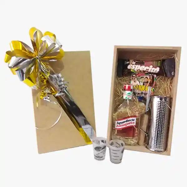 Esta linda caja es perfecta para tu familiar u amigo al que le encanta el vallenato!! En ella encontraras: -Aguardiente antioqueño rojo, (375ml). -Maní "La Especial Limón & Pimienta" (40g). -Guacharaca. -Copa con mensaje y medidas (2). -USB con canciones de vallenato.