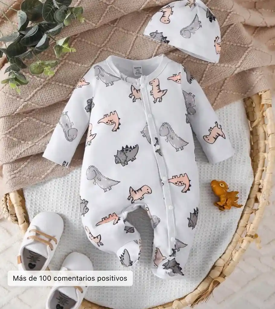 Talla 0-1 recién nacido Este conjunto de dos piezas está diseñado para mantener a tu pequeño explorador abrigado y feliz durante todo el día o la noche. • Conjunto Coordinado: Incluye un mameluco enterizo y un gorrito protector con el mismo estampado de dinosaurios, ideal para mantener una temperatura adecuada. • Diseño Divertido: Estampado dinámico de diversos dinosaurios en tonos tierra y grises sobre un fondo blanco limpio, perfecto para un estilo moderno. • Fácil de Poner: Sistema de broches frontales de presión que se extiende hasta la pierna, facilitando el cambio de pañal y el vestir al bebé sin complicaciones. • Suavidad Garantizada: Confeccionado en algodón elástico de tacto suave, permitiendo que la piel del bebé respire mientras se mueve con total libertad. • Protección Completa: Diseño con pies cubiertos que asegura que los pies del bebé permanezcan calientes, eliminando la necesidad de medias adicionales.