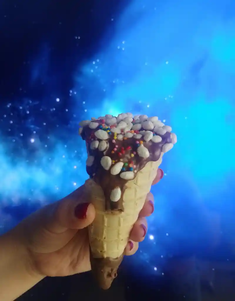 Cono trufado con relleno de Kiwi, cobertura de chocolate negro, con los siguientes toppings Nutella, chispas de colores y arroz soplado.