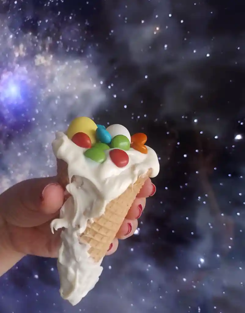 Cono trufado con relleno de coco, cobertura de chocolate blanco, con los siguientes toppings almendras, lecherita y MM.