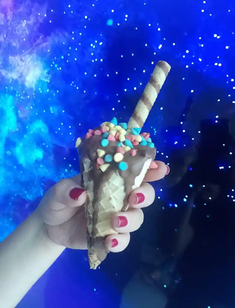Cono trufado con relleno de fresa, cobertura de chocolate negro, con los siguientes toppings Nutella, barquillo Piazza y chips de chocolate sabor a chicle.