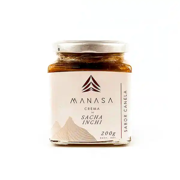 Manasa crema de sacha inchi sabor canela. Presentación: frasco por 200 gramos. Packing: Frasco