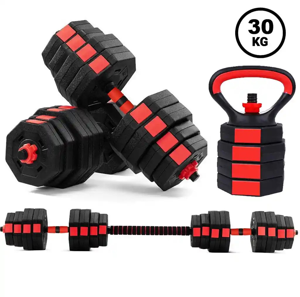 "Set multifuncional 3 en 1 Fitnics: Mancuernas, kettlebell y barra ajustables hasta 30 kg para personalizar tu entrenamiento al máximo. - Set multifuncional de mancuernas, kettlebell y barra que puedes usar en cuatro configuraciones para personalizar tu entrenamiento al máximo: mancuernas, kettlebell, barra ligera y barra pesada. - Discos octogonales para que puedas usar como apoyo. - Agarres acolchados y antideslizantes para tu comodidad. - Fáciles de montar y desmontar. - Compacto y fácil de almacenar. ----------------------------------------------------------------------- FICHA TÉCNICA: - Peso total 30 kg. - 16 Discos octogonales. - 2 Barras cortas. - 1 Barra larga. - 1 Accesorio para kettlebell. - Agarres acolchados y antideslizantes. - Material de los discos: polietileno rellenos de cemento. ----------------------------------------------------------------------- MODOS DE USO: - Entrenamiento de fuerza. ----------------------------------------------------------------------- MEDIDAS: - Barra larga: 40 cm. - Barras cortas: 34 cm. - Accesorio para kettlebell: 35 x 15 x 9,5 cm. - Peso total barras: 1,08 kg. - Peso accesorio para kettlebell: 0,64 kg. - Discos: 1,25 kg: 15,2 x 3,5 cm. 1,5 kg: 16,5 x 3,5 cm. 2 kg: 17,9 x 4,3 cm. 2,5 kg: 19,3 x 4,5 cm. - Peso Total: 30 kg. **FITNICS® es distribuida en Colombia exclusivamente por Builder Commerce SAS** ----------------------------------------------------------------------- QUE VIENE EN LA CAJA: - 4 Discos de 1,25 kg. - 4 Discos de 1,5 kg. - 4 Discos de 2 kg. - 4 Discos de 2,5 kg. - 1 Barra larga. - 2 Barras cortas. - 4 seguros. ----------------------------------------------------------------------- PREGUNTAS FRECUENTES ¿Los productos tienen garantía? Sí. Todos nuestros productos cuentan con 6 meses de garantía limitada contra defectos de fabricación. ¿El precio indicado incluye IVA? Si, si incluye IVA el precio publicado.