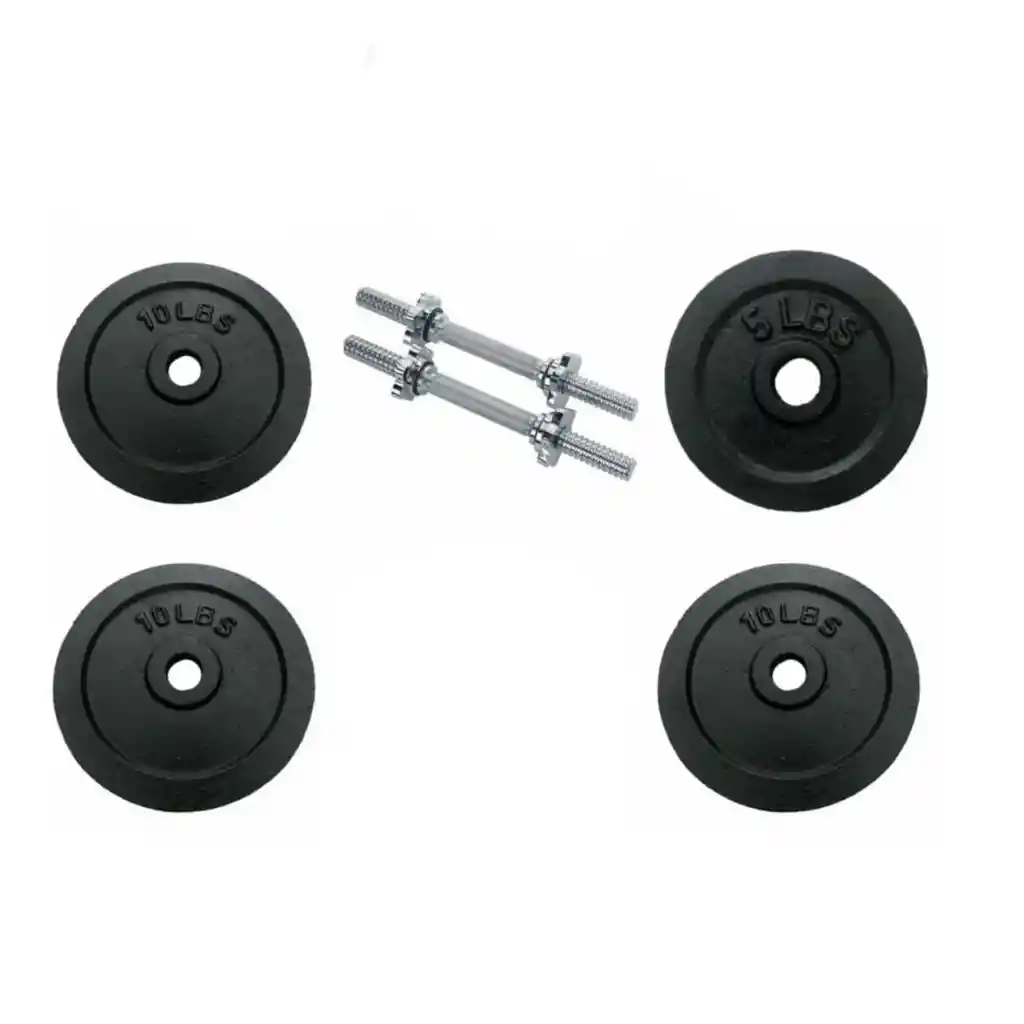 Material: discos de Hierro colado y barras en acero cromado Distribución del peso: 4 discos de 10lb Peso de cada barra, 2,5lb Seguro roscado Discos estándar Garantía de 1 añoNO INCLUYE ESTUCHE