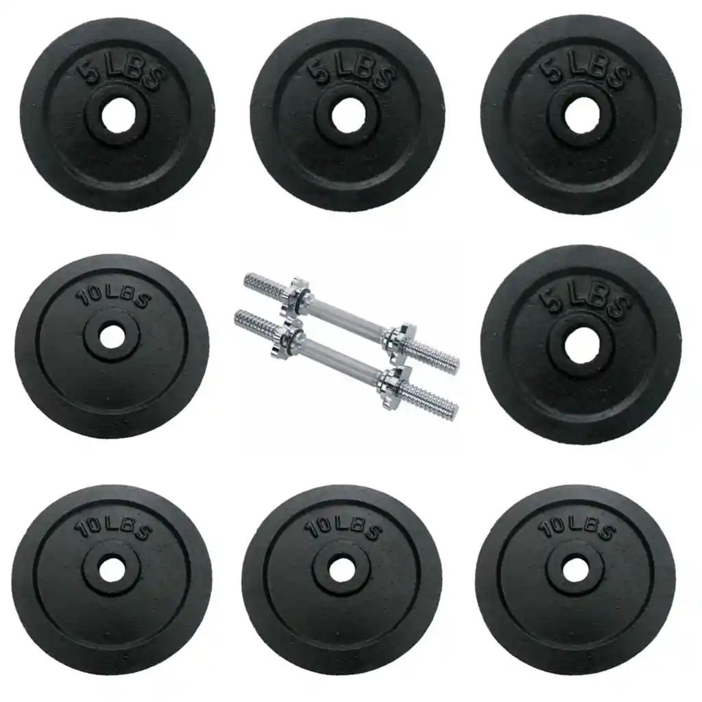 Material: discos de Hierro colado y barras en acero cromado Distribución del peso: 4 discos de 10lb + 4 discos de 5lb . Peso de cada barra 2,5lb Seguro roscado Discos estandar Garantia de 1 año.NO INCLUYE ESTUCHE