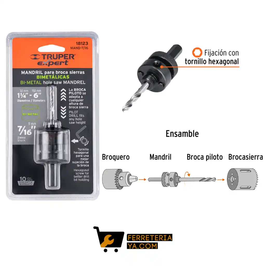 Mandril Sierra Copa Bimetalica 7/16 Truper - 18123 CARACTERÍSTICAS • Broca piloto de HSS de 1/4" ajustable a cualquier altura de brocasierra, compatible con otras marcas del mercado • Punta split point autocentrable para perforaciones más rápidas y precisas • Tornillo hexagonal para mejor sujeción y ajuste de la broca piloto • Para brocasierra bimetálicas de 1 1/4" hasta 6" • Sistema de sujeción con rosca y perno • Compatible con broca piloto modelo MAND-BRB marca Truper® Expert • Fácil ensamble sin necesidad de herramientas