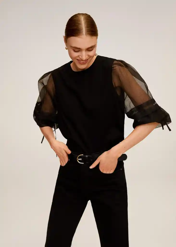 Blusa mangas abullonadas - Composición: 100% algodón Mangas: 100% poliéster .Lavar a maquina max 30°c centrifugado corto.No usar lejia.Plancha max 110°c.Limpiar en seco percloroetileno.No se puede usar secadora.