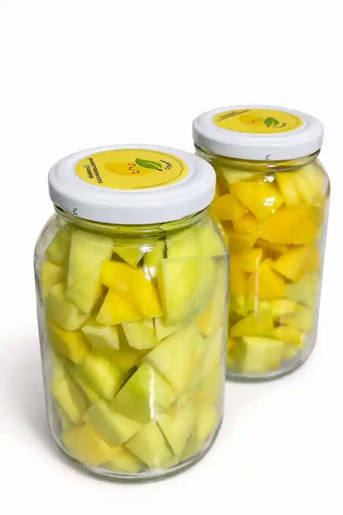 Mango empacado en recipiente de conserva de 500 ml, desinfectada, picada y lista para usar