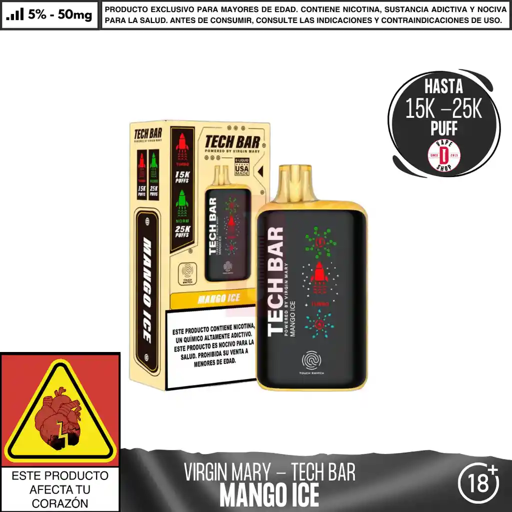 Contenido del paquete: 1 dispositivo desechable Concentración de nicotina: 25000 PUFF - 5% de nicotina salina en peso Características del dispositivo: Dispositivo de vapeo desechable 25 ml de capacidad 1 dispositivo por paquete Batería: 650 mAh (Recargable) Hasta 25000 caladas aproximadamente. 2 modos de potencia : Norm 25.000 PUFF (aprox)- Turbo 15.000 PUFF (aprox). Ingredientes: Glicerina Vegetal, Propilenglicol, Aromatizantes Naturales y Artificiales, Ácido Benzoico, Nicotina. Advertencia: Contiene nicotina, que puede ser venenoso. Evitar el contacto con la piel y los ojos. No ingerir. Mantener siempre en empaque original y en un ambiente fresco y seco. Mantener alejado de niños y mascotas. No debe utilizarse por Mujeres en estado de embarazo o personas con problemas de respiración como el asma. En caso de accidente contacte a la línea 123. PROHIBIDA SU VENTA A MENORES DE 18 AÑOS.