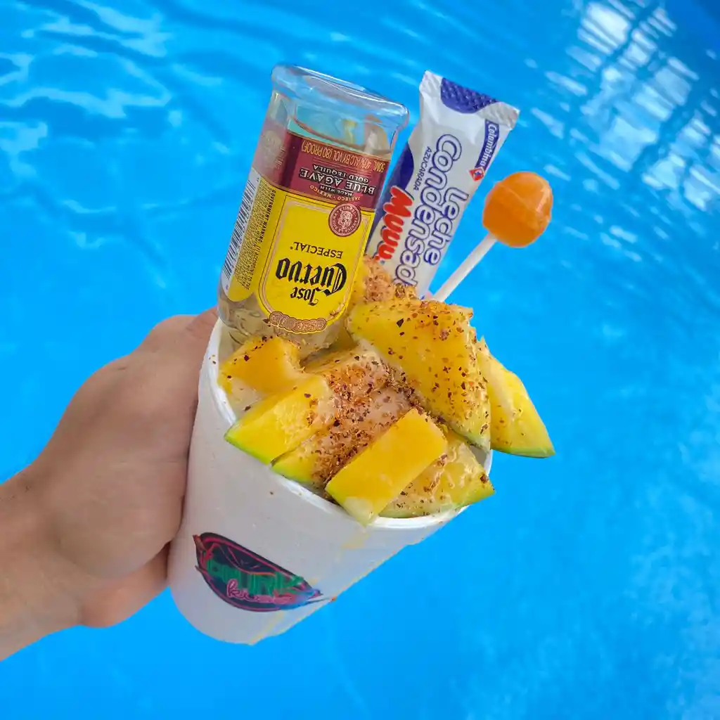 Granizado A Base De Tequila Con Sabor A Mango Biche, Acompañado De Mango Biche Y Toppings. . .