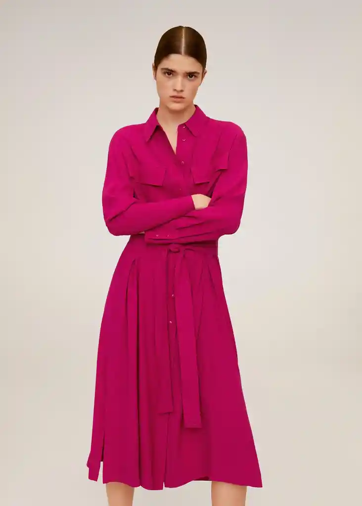 Aberturas Laterales Cierre de Botones Cinturón Ajustable Corte Recto Cuello Clásico Diseño Midi Dos Bolsillos de Solapa en el Pecho Estilo Camisero Manga Larga Puños Abotonados Tejido Fluido - 67024406_88