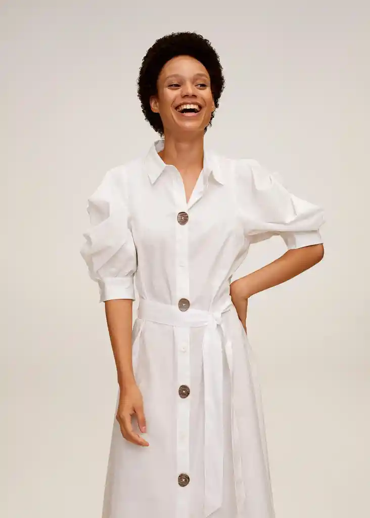 Cierre de Botones en la Parte Delantera Cuello Clásico Diseño Acampanado Lazo a la Cintura Manga Corta Abullonada Tejido Popelínde Algodón - 67017887_01