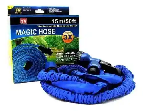 Manguera Expandible Encogible 15 Metros – Práctica, Ligera y Súper Resistente Descripción:La Manguera Expandible de 15 metros es ideal para el riego del jardín, lavado de autos o limpieza en el hogar. Su diseño inteligente permite que se expanda al llenarse de agua y se contraiga automáticamente cuando se vacía, facilitando su almacenamiento. Características principales: Extensible hasta 15 metros al activarse con la presión del agua. Se encoge a un tercio de su tamaño cuando no está en uso, ahorrando espacio. Material resistente y flexible que evita enredos, torsiones o rupturas. Incluye pistola de riego con múltiples funciones de salida de agua. Conectores universales fáciles de adaptar a cualquier grifo estándar. Ideal para:Jardinería, lavado de vehículos, patios, terrazas y labores de limpieza en general. Gracias a la manguera expandible/encogible nuestras labores del hogar se facilitan mucho más ya que nos ahorramos tiempo al guardarla, en lugar de tener que enroscar sección por sección, también nos evita la molestia de otras mangueras que se doblan y ya no sale agua, es muy fácil de transportar a cualquier lugar gracias a su peso tan liviano, hasta un niño la puede cargar sin problema. La manguera exterior está elaborada por nylon de alta calidad con hilos expandibles lo que hace que pueda expandir 3 veces su tamaño. ABRIR LA LLAVE DE AGUA GRADUALMENTE PARA EVITAR QUE LA PRESIÓN LA REVIENTE (SI ESTO OCURRE, NO ES VALIDA LA GARANTIA) *INCLUYE* 1 manguera, 1 pistola de rociado, acoplas, empaques *DIMENSIONES* 15 mt de longitud expandida PRODUCTO IMPORTADO