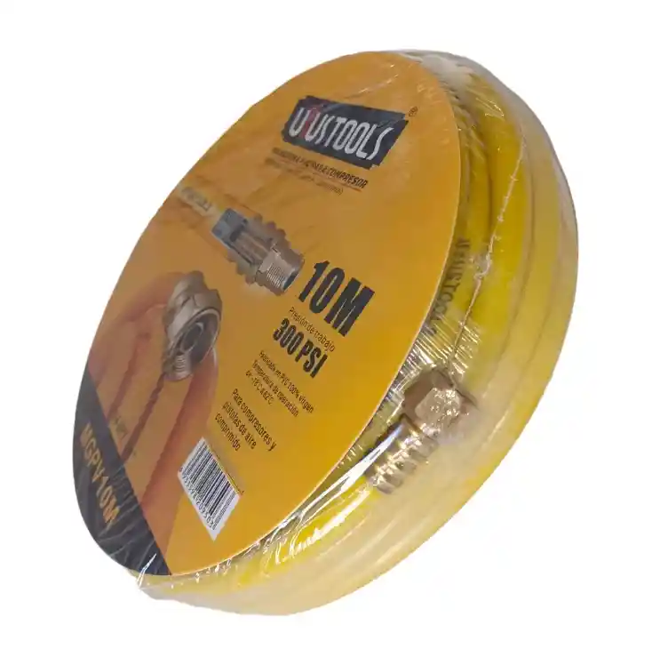 • Manguera Fabricada en PVC 100% virgen • Temperatura de operación de -18°C a 82°C • reforzada con tejido de fibra sintética • Para uso en compresores y pistolas de aire comprimido • Conexiones en bronce con rosca externa 1/4" NPT (6.3mm) • Marca UYUSTOOLS
