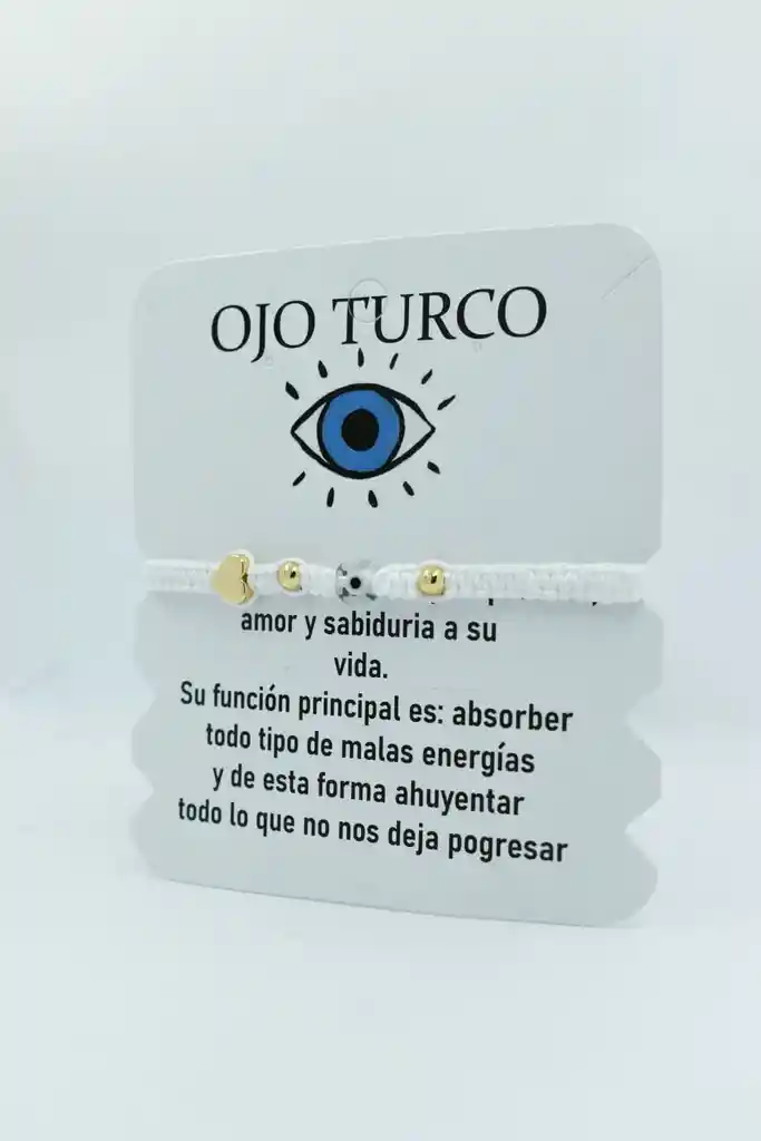 HERMOSA MANILLA DE COLOR BLANCO ACOMPAÑADO DE UN OJO TURCO, ELABORADAS CON HILO Y ORO GOLFIELD, PERFECTA PARA ALEJAR EL MAL