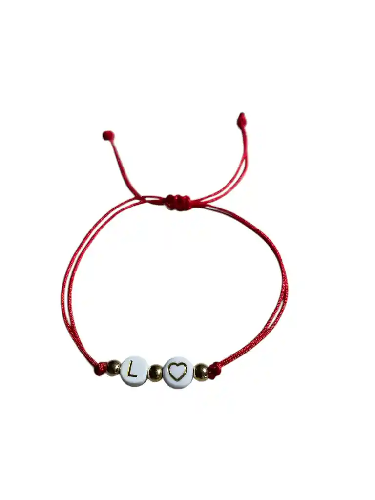MANILLA HILO ROJO CON LETRA ACRILICA L+ CORAZON ACRILICO DORADO Composición: - hilo coreano celular rojo 0,8mm - separador acrílico blanco con letra/símbolo corazón dorado - 2 balines de baño de oro #4 mm Tamaño: 16 - 18cm
