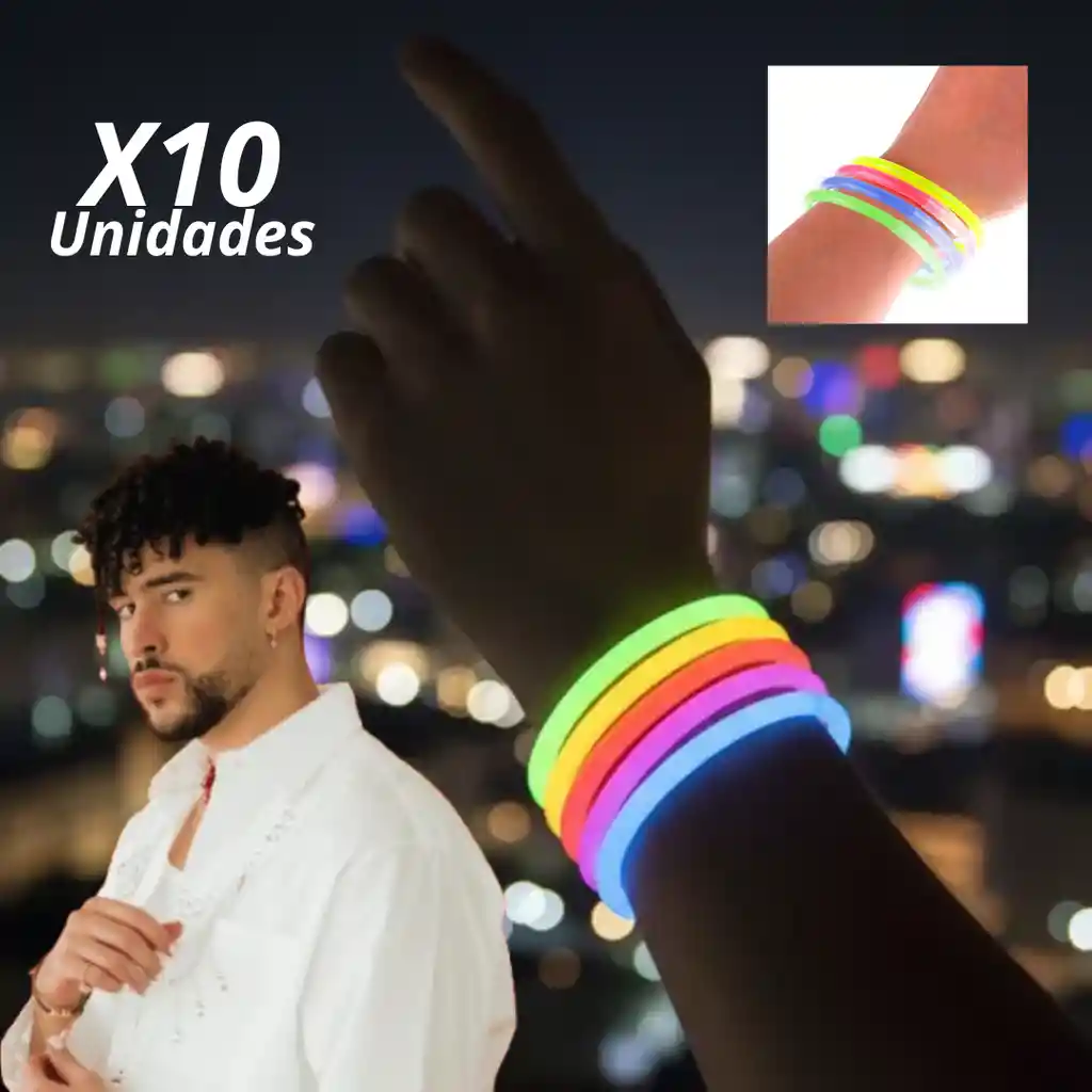 Manilla ó Pulsera de Neon de diferentes colores que iluminan en la oscuridad. Paquete por 10 Unidades para Concierto Bad Bunny