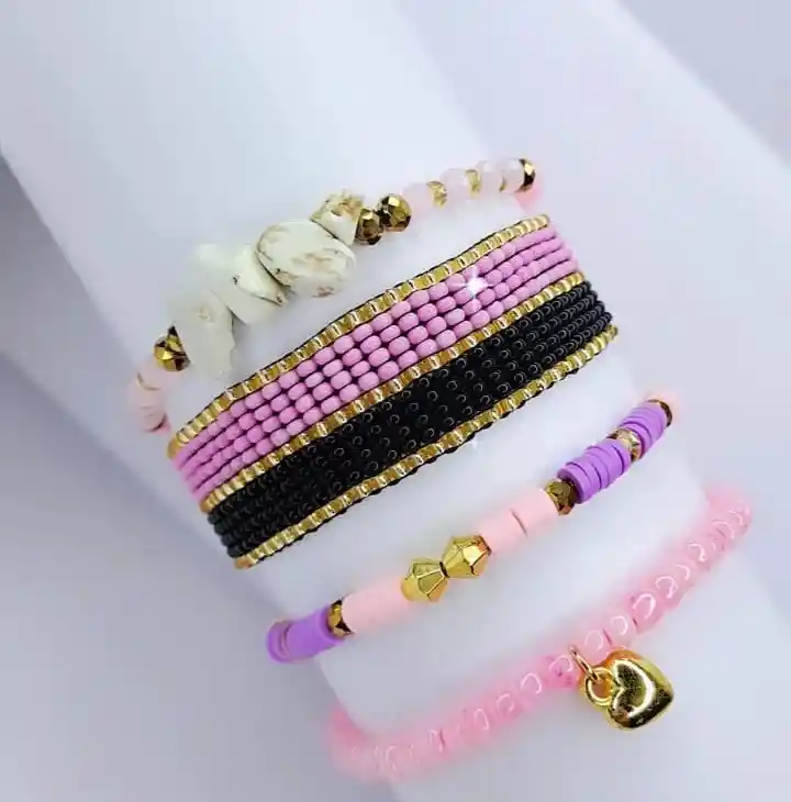 CINCO MANILLAS DE COLOR NEGRAS Y MORADA CON CORAZON DORADO, PERFECTO PARA COMBINAR TU LOOK, PARA VERTE UNICA Y HERMOSA