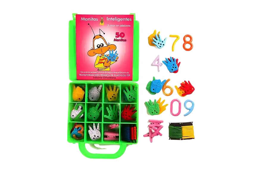 Maletín didáctico que contiene 5 plantillas de colores, 25 manitas izquierdas, 25 manitas derechas, 10 números de 0 al 9, 8 signos matemáticos. Permite aprender la lateralidad, reconociendo la mano derecha e izquierda, a contar, motricidad fina, clasificación, estimula el razonamiento lógico matemático.