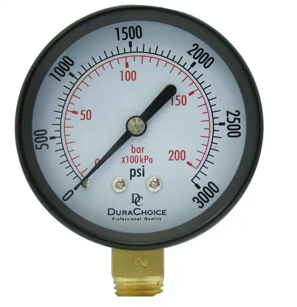 Los medidores secos para uso general de la marca DuraChoice son algunos de los mejores del mercado. Envueltos en una caja de acero negro y con una ventana de vidrio, estos manómetros secos son tan resistentes como cualquier manómetro comparable. Estos medidores funcionan en muchas aplicaciones y son buenos para agua, petróleo, gas (WOG) y diésel. El diseño de montaje inferior hace que el medidor seco sea fácil de montar verticalmente. La pantalla de doble escala del medidor es fácilmente legible con numeración y marcas en rojo y negro en una cara blanca. Movimiento: Aleación de cobre Tubo Bourdon: aleación de cobre. Ventana: Vidrio Caja: Caja de acero para protección en ambientes hostiles (pintada en negro) Conexión: Montaje inferior de aleación de cobre; 1/8" NPT (para esfera de 1-1/2") Temperatura ambiente normal: -30 °F a +140 °F (-34 °C a +60 °C) LA COMPRA INCLUYE: 1X MANOMETRO ANALOGO 3000psi