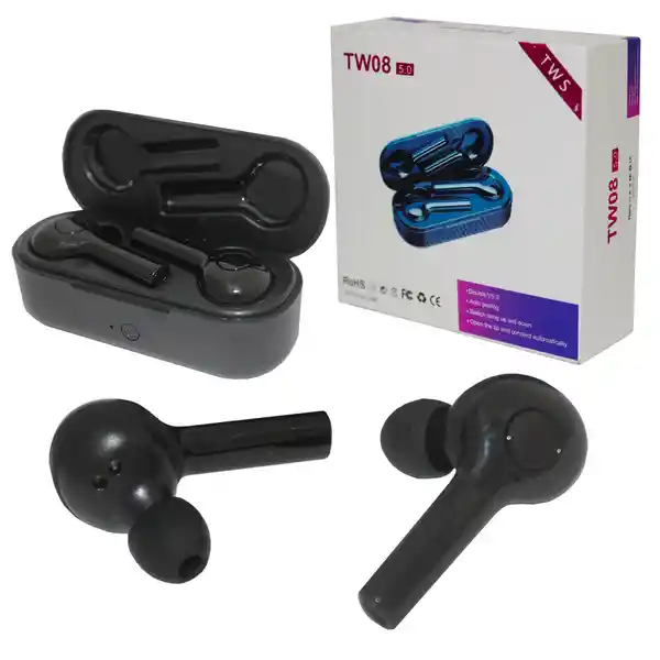 Auriculares inalámbricos TWS-08 versión 5.0. capacidad de batería 50mAh.Distancia de transmisión de 10 a 20 metros. Frecuencia 2.405-2.480GHz. poder de transmicion: clase 2 duracion de carga: 3 a 4 horas bluetooth: 5.0 Tiempo de carga: 1 hora Entrada: 5v.