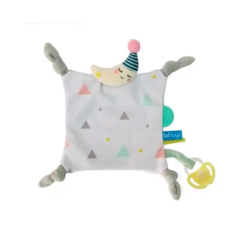 Hermosa manta de apego con la cual los bebés vivirán experiencias asombrosas. Entrarán a un mundo lleno de texturas a explorar todo el campo sensorial. Pueden impregnar el olor de la mamita, su tela es muy suave y no genera alergias; es muy liviana y como los bebés tienden a tapar su carita y no correrán el riesgo de lastimarse. Sirve también como mordedor y cuenta con figuras muy llamativas. Tamaño = 15 X 11 X 2 Cms. Edad recomendada a partir de 0 meses.