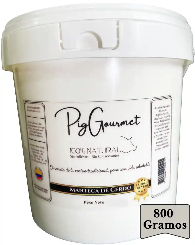 La manteca de cerdo x 800 gramos de PigGourmet, es 100% natural, no contiene aditivos ni conservantes y no es sometida a procesos químicos para desodorizar o blanquear. Se obtiene a partir del proceso de cocción lento de la empella de cerdo y posteriormente filtrada cuidadosamente para tener como resultado una manteca clarificada de la más alta calidad. El color de la manteca, varía de blanco a perlado e incluso un ligero amarillo, según lote de producción.