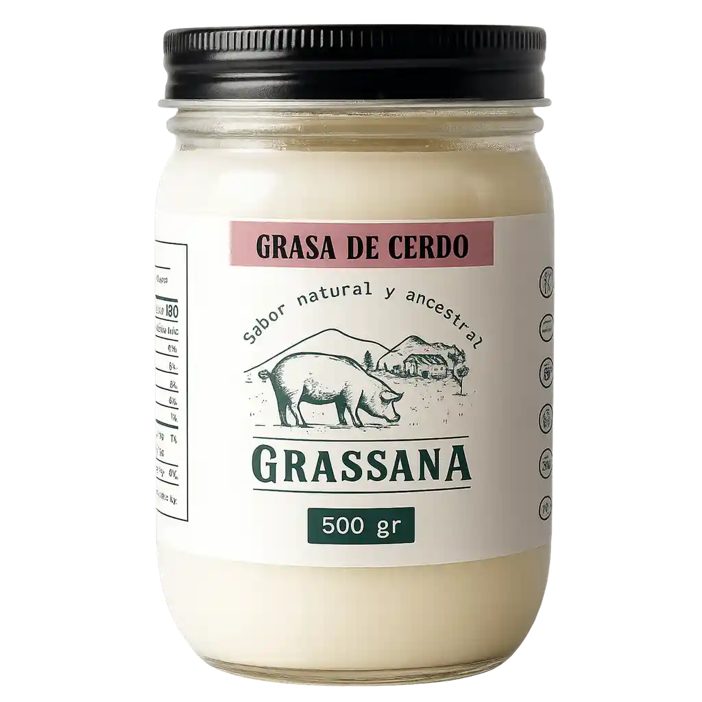 Manteca Grasa de cerdo Grassana grasa 500 ml y es 100% natural La marca Grassana es una marca comprometida con tu salud y bienestar por eso Nuestra manteca de cerdo es 100% natural siendo la opción perfecta para aquellos que buscan una alternativa saludable y deliciosa a los aceites vegetales refinados e hidrogenados. Contamos con Registro: INVIMA RSA-0029549-2024 Inspirados en las dietas simples pero poderosas de nuestros antepasados, nuestros productos están diseñados para ser consistentes con nuestra biología evolutiva única. Con Grassana, puedes disfrutar de una grasa de alta calidad. La manteca de cerdo perfecta. ¡Únete a nuestra revolución y descubre los beneficios de una alimentación más natural y saludable! Envasada en frasco de VIDRIO que contrario a los envases PLÁSTICOS no tienen riesgo de descomposición de plástico que los recubre y la formación de sustancias indeseables como las dioxinas y otros tóxicos que pueden migrar a la grasa. Somos amigables con el ambiente. POR UN MUNDO CON MENOS PLÁSTICO