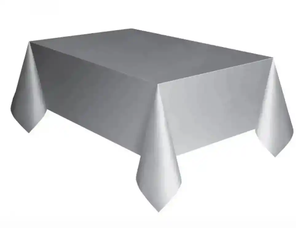 Mantel Platico Plateado rectangular, reusable. Ideal para decorar tus fiestas y reuniones. medidas 137 cm X 183 cm