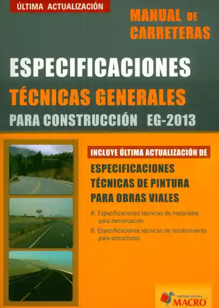 Editorial Macro Presenta el Nuevo Manual de Carreteras Especificaciones Técnicas Generales Para Construcción Eg-20 13 Actualizada al Mes de Febrero de 2013 Por Resolución Directoral N.O 03-2013-Mtc/14. Dicha Norma ha Sido Sustentada Con Informe Técnico no 001-2013-Mtc/14.04 y Presentada Para su Trámite de Aprobación Correspondiente Mediante Informe no 1 0-2013-Mtc/14.04 de Fecha 31 de Enero de 2013 el Cual Tiene Por Finalidad Uniformizar Las Condiciones Requisitos Parámetros y Procedimientos de Las Actividades Relativas a Las Obras de Infraestructura Vial. Esto Con el Propósito de Estandarizar Los Procesos Que Conduzcan a Obtener Los Mejores Índices de Calidad de la Obra Que a su Vez Tienen Por Objeto Prevenir y Evitar Las Probables Controversias Que se Generan en la Administración de Los Contratos. ISBN: 9786123041168