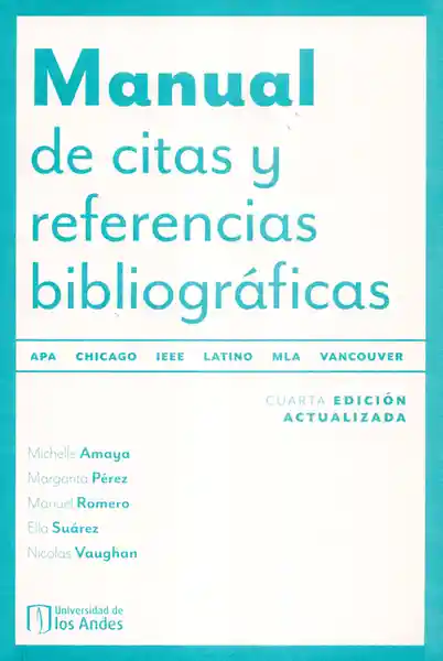 Nicolás Vaughan. Editorial: Universidad de Los Andes. Año: 2020. Este Manual Recoge Los Sistemas de Citas y Referencias Bibliográficas Más Relevantes de Las Diferentes Disciplinas Académicas. Está Diseñado Como un Instrumento de Fácil Comprensión y Aplicación, Para la Redacción de Todo Tipo de Textos Académicos. Esta Cuarta Edición Incluye Las Últimas Actualizaciones de Apa (2019) y Chicago, Además de un Nuevo Capítulo Dedicado a Los Manejadores de Referencias Bibliográficas, Tales Como Endnote y Biblatex, Herramientas Fundamentales en la Administración de la Bibliografía. Libros de Referencia. Guías. ISBN: 9789587749380