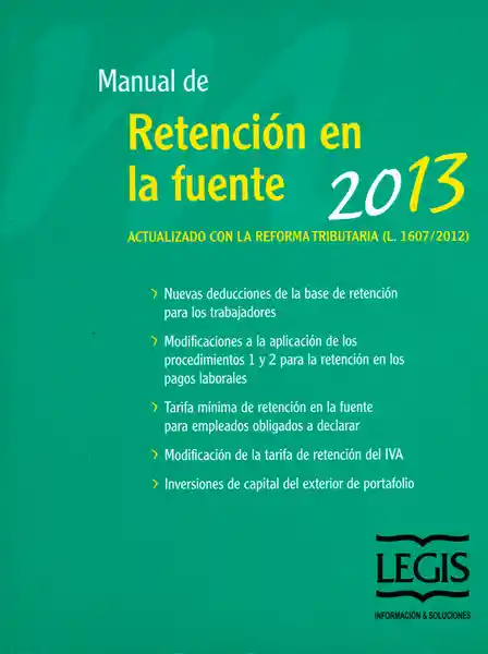Actualizado Con la Reforma Tributaria (L. 1607/2012) Tarifas de Retención. Sinopsis Novedades de la Retención en la Fuente a Través de Entidades Financieras Cifras y Calendario Tributario Para el Año 2013 Modificaciones a la Retención en la Fuente en Los Impuestos de Renta e Iva. Ayudas Prácticas ISBN: 9789587670288