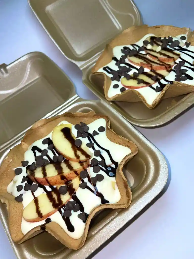 Manzana en trozos con una crema deliciosa artesanal servida en cucurucho estrella, con una salsa y chips de chocolate.