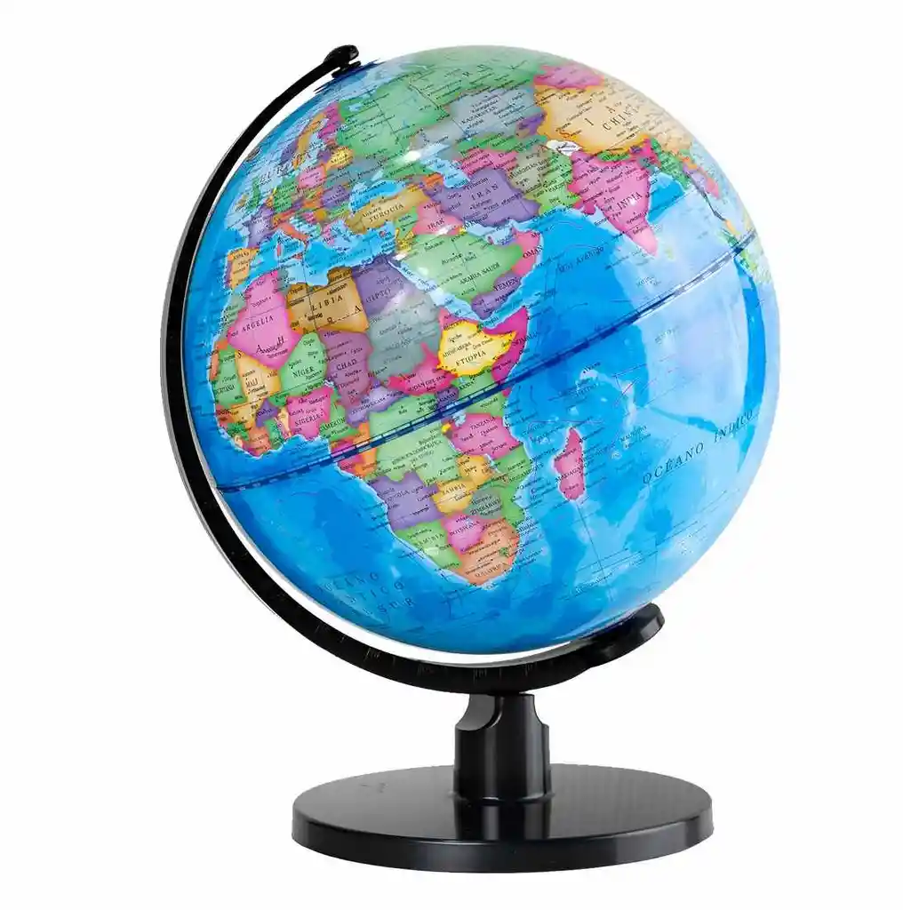 Este globo terráqueo educativo es una herramienta ideal para el aprendizaje y la decoración, ya que muestra de forma clara y colorida los países, océanos y continentes del mundo; cuenta con una base y soporte resistente que permite girarlo fácilmente para explorar diferentes regiones, siendo perfecto para estudiantes, profesores o amantes de la geografía, además de ser un accesorio decorativo elegante y llamativo para cualquier espacio. Ficha Tècnica: Diámetro: 25 cm Altura: 29 cm Material : Plástico ABS ** _Para defectos de fábrica o retractos: \_Por favor revise el producto apenas lo reciba y antes de usarlo. No aplican ley de retracto o defectos de fábrica luego de usar el producto. Se manejan máximo 5 días para reportar defectos de fábrica (por ejemplo, producto funciona mal, piezas faltantes, rotas, etc). Para hacer efectiva la devolución el producto debe devolverse con el empaque original, el cual debe estar en buen estado, incluir todos los documentos y las partes completas y sin daños.