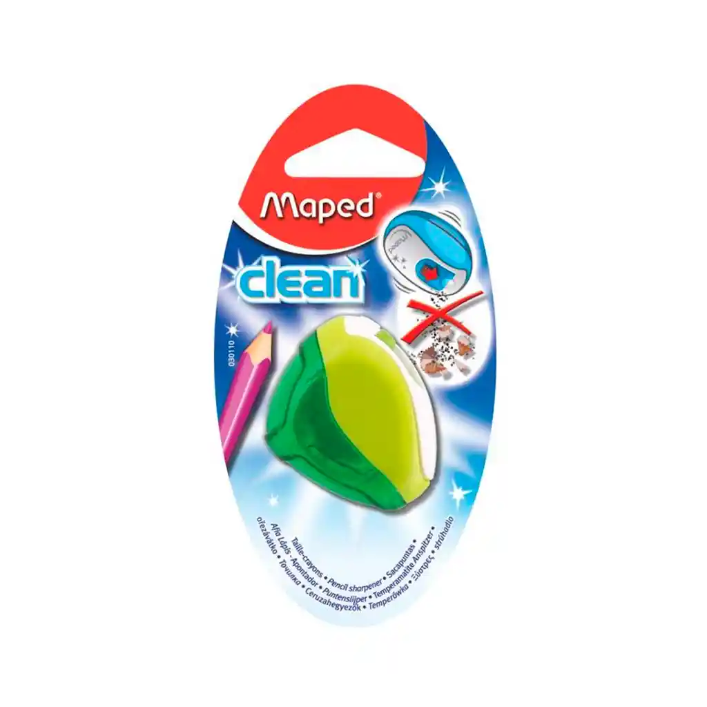 BLISTER TAJALAPIZ MAPED CLEAN SENCILLO ¡Claro y limpio! los sacapuntas Clean conservan las virutas gracias a su tapa protectora . Se abren y se cierran sin manipulación presionando sencillamente en el lápiz. Tamaño aproximado: 4x3 cm Limpio /Apertura y cierre automático del sacapuntas 1 agujero