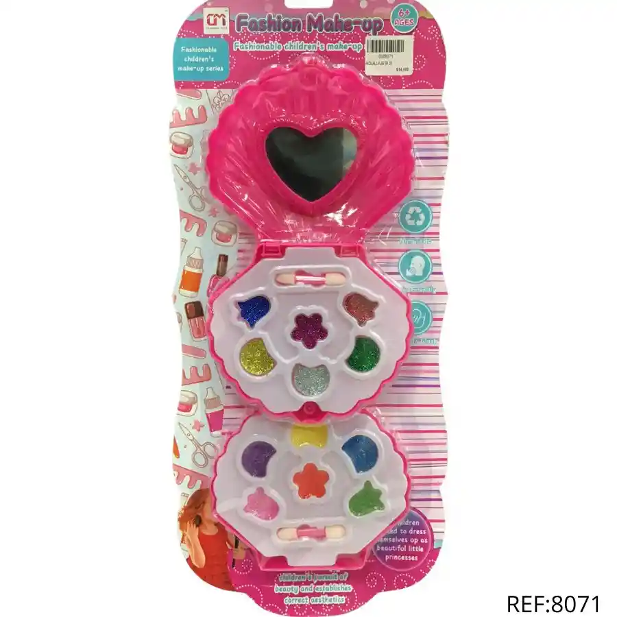 Set de maquillaje infantil con estuche en forma de concha. Incluye espejo, colores brillantes y aplicadores. Ideal desde 6 años.