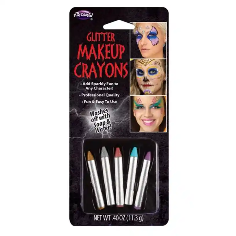 Sea creativo con estos crayones de maquillaje para Halloween de Fun World. Este conjunto incluye cinco colores vibrantes y fáciles de aplicar. Los crayones de maquillaje con purpurina cuentan con una fórmula de calidad profesional que se lava con agua y jabón. Adecuados para niños de 8 años en adelante, son una opción divertida para prepararse para ir a pedir dulces. Utilice colores individuales o combínelos para lograr los resultados ideales. Crayón de maquillaje con purpurina para Halloween de Fun World: Añade un poco de brillo a tu rostro. Se lava con agua y jabón. Incluye 5 crayones de Halloween con purpurina. Ver imágenes para instrucciones, contenidos y advertencias. Calidad profesional Divertido y fácil de usar Crea una variedad de caras de personajes. Recomendado para mayores de 8 años.