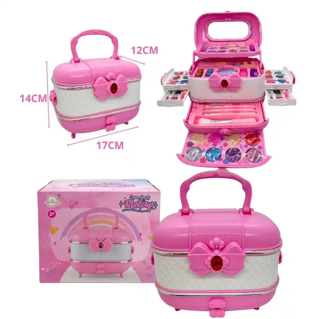 Set de maquillaje infantil lavable HERMOSO COFRE Este set contienen diferentes accesorios con los que los niños pueden jugar para mejorar su creatividad y sus habilidades estéticas. Es facil de limpiar. Este kit de maquillaje es el juguete perfecto, podran pasar muchas horas de diversión y se probarán varios maquillajes y estilos. Contiene : sombra de ojos en clider Sombras mate Aplicadores maquillaje esmalte de uñas Brillo labio Labial Lima uñas Serador dedos Caja metalica con espejo