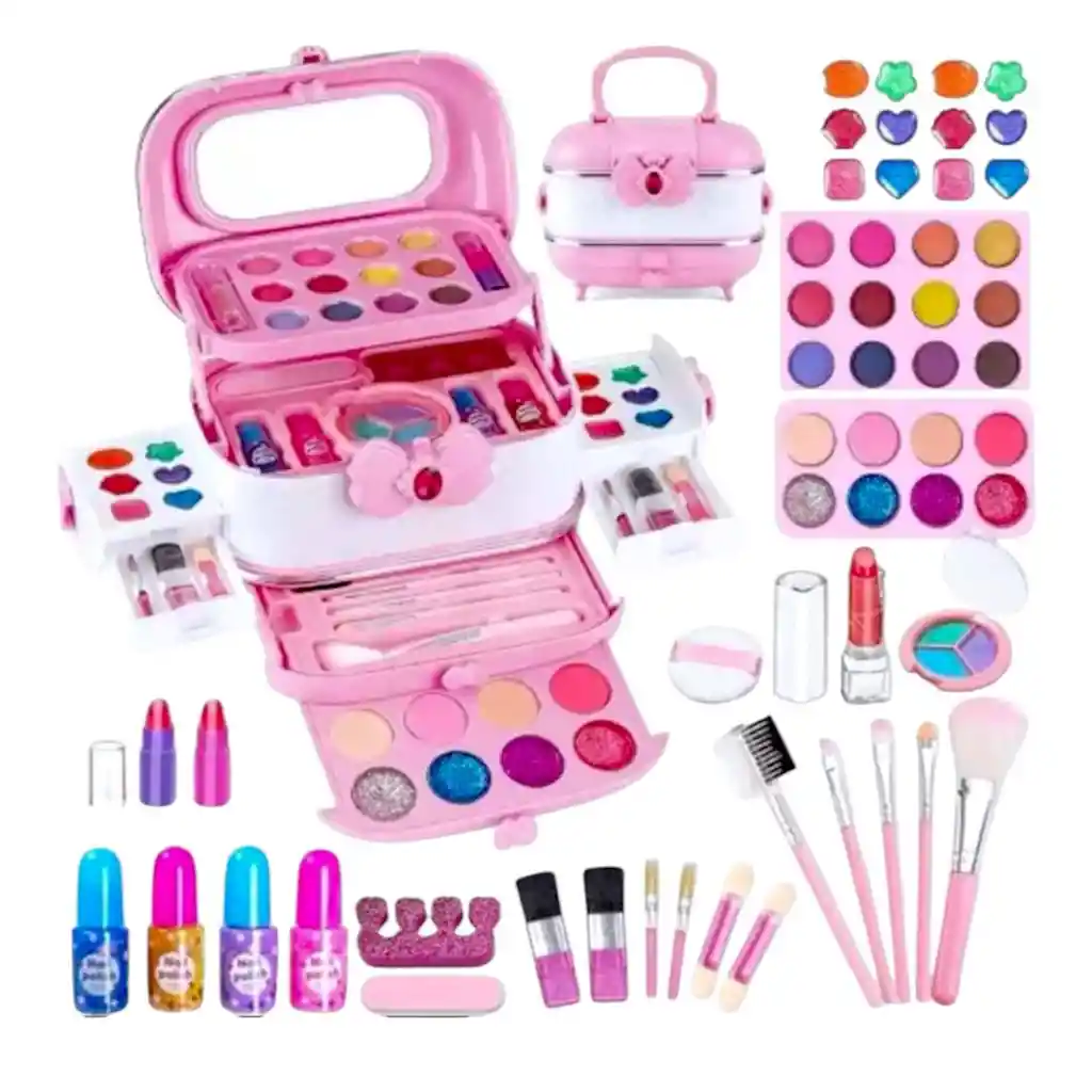 Set de maquillaje infantil lavable HERMOSO COFRE Este set contienen diferentes accesorios con los que los niños pueden jugar para mejorar su creatividad y sus habilidades estéticas. Es facil de limpiar. Este kit de maquillaje es el juguete perfecto, podran pasar muchas horas de diversión y se probarán varios maquillajes y estilos. Contiene : sombra de ojos en clider Sombras mate Aplicadores maquillaje esmalte de uñas Brillo labio Labial Lima uñas Serador dedos Caja metalica con espejo