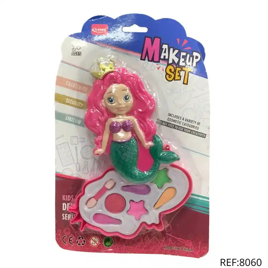Set de maquillaje infantil con figura de sirena. Incluye colores divertidos y aplicadores. Ideal para niñas desde 3 años.