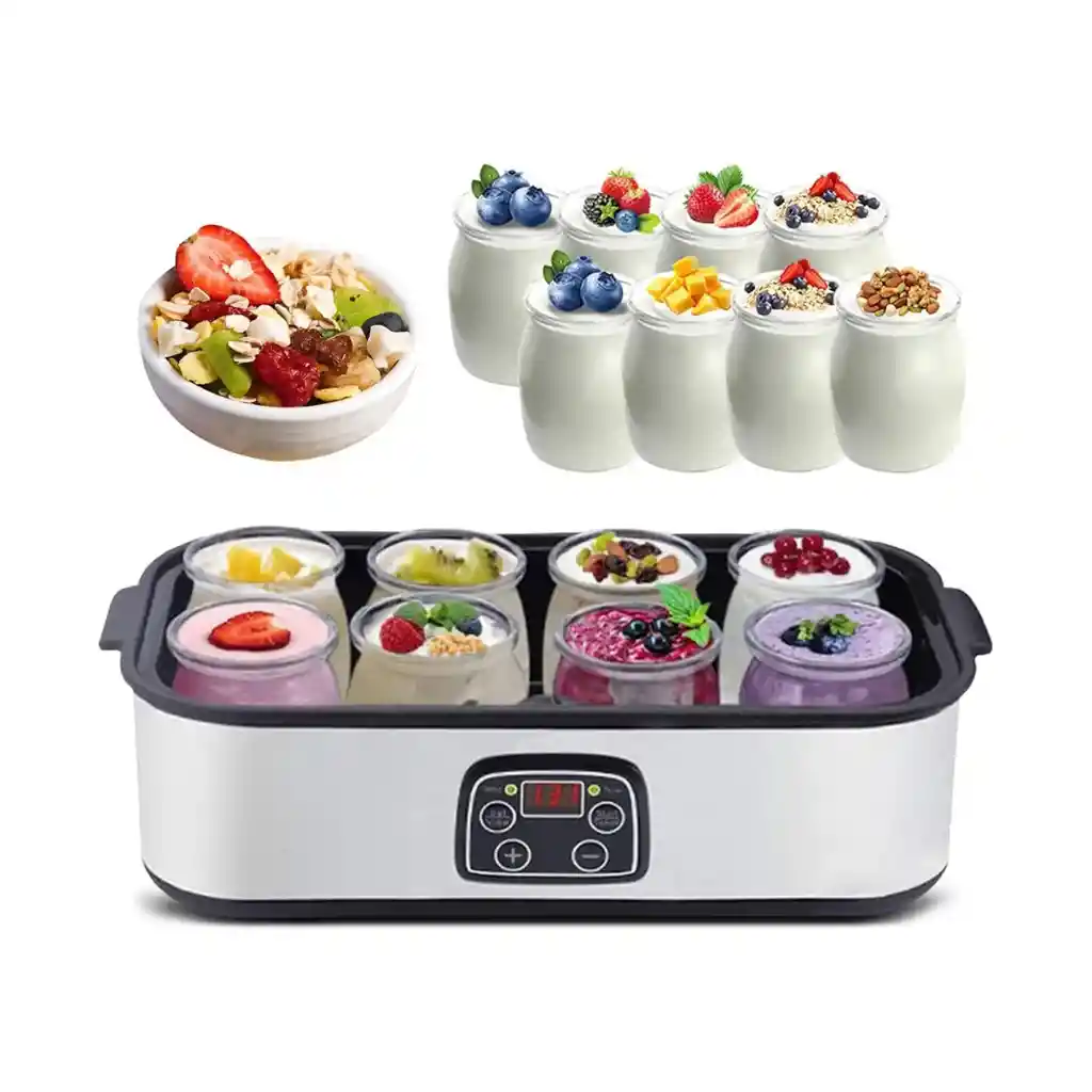 8 FRASCOS DE VIDRIO INDIVIDUALES: Incluye 8 frascos de vidrio, cada uno con una capacidad de 180 ml (6 oz), lo que te permite preparar varios sabores a la vez. Ideal para un fácil almacenamiento y control de porciones. 1400 ML DE YOGUR NUTRITIVO: Esta yogurtera puede preparar hasta 1400 ml de delicioso y nutritivo yogur en casa. Ocho tazas de yogur asegurarán que toda tu familia tenga suficiente yogur saludable. FUNCIONAMIENTO DE BAJO CONSUMO DE 25 W: Nuestra yogurtera doméstica funciona con solo 25 W, ofreciendo una solución de bajo consumo para preparar yogur casero natural, manteniendo una temperatura constante de 360 para obtener resultados óptimos. CONTROL POR MICROCOMPUTADORA Y PANTALLA LCD: La yogurtera automática cuenta con una pantalla LCD digital que permite ajustar el tiempo (de 1 a 48 horas) y la temperatura (de 20 a 55 C). Con función de apagado automático y alarma sonora, preparar yogur es muy fácil. MATERIALES SALUDABLES: Nuestros recipientes y el resistente cuerpo de acero inoxidable, junto con los frascos de vidrio, garantizan una transferencia de calor estable y uniforme.