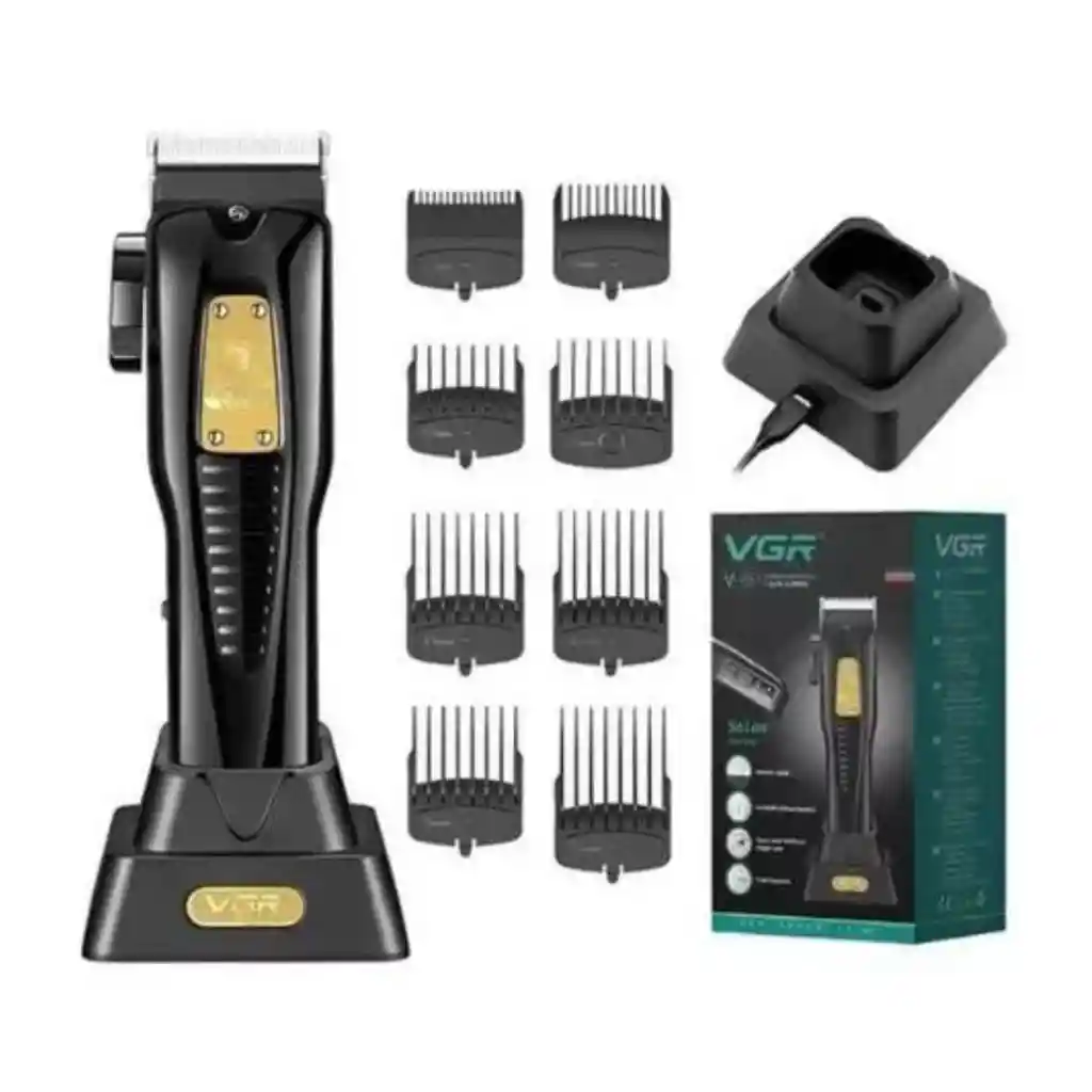 Descripción Cortadora de pelo profesional VGR Modelo: V-651 Fuente de alimentación: USB Tiempo de trabajo: 200 minutos Tiempo de carga: 3 horas Batería: Batería de iones de litio de 2000 mAh Material de la hoja: cuchilla de cerámica y pulvimetalúrgica Material del producto: Metal y plástico Método de limpieza: cepillo seco Entrada: DC 5V 1A Potencia: 5W RPM: 6000 Tamaño del paquete: 23,7*14*9,8 cm Peso del embalaje del producto: 916G Longitud de corte: 0,8-18Mm Cortadora de pelo profesional VGR 1. Batería de gran capacidad: La batería de iones de litio de 2000 mAh se puede utilizar durante aproximadamente 200 minutos y la duración de la batería puede alcanzar más de 5 años. 2. Ajuste de varias velocidades: puede usar diferentes engranajes para cambiar la velocidad del cortapelos (6000 ± 500/7000 ± 500), haciendo que la operación sea más conveniente. 3. Carga USB: esta cortadora de cabello se puede cargar usando un tipo C o cargandoBase, Eliminando la necesidad de cargadores tradicionales y facilitando la carga con una variedad de fuentes de energía. Esta función es muy conveniente para el uso en movimiento. 4. Pantalla LED: esta cortadora de pelo está equipada con una pantalla LED que puede mostrar la altura de corte actual y el nivel de batería, lo que facilita el uso y la energía restante, y es más inteligente. 5. Palanca cónica ajustable: esta cortadora de pelo cuenta con un diseño de palanca cónica ajustable, que se puede ajustar de acuerdo con diferentes estilos de cabello y necesidades, lo que hace que su proceso de corte de pelo sea más conveniente y rápido. Lo que obtienes 1 * cortadora de pelo 8 * Peine guía (1,5/3/4, 5/6/9/12/15/18mm) 1 * Base de carga 1 * Cable de carga USB 1 * Manual de instrucciones 1 * cepillo de limpieza