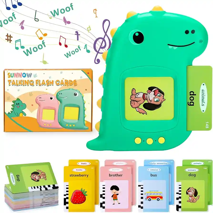 Maquina de Aprendizaje con Tarjetas de Vocabulario en Inglés y Español, Diseño Dinosaurio en Verde y Rosado, Se Recarga con cable USB Incluido 🌈Emocionante viaje de aprendizaje con tarjetas intermitentes para hablar: Dale a tus pequeños una experiencia de aprendizaje interactiva e emocionante con nuestros juguetes preescolares únicos Estas herramientas de aprendizaje temprano proporcionan sonidos realistas para animales, vehículos y más (aunque algunas tarjetas no tienen efectos de sonido), emparejadas con ilustraciones encantadoras e imaginativas. La función de pronunciación automática está diseñada para atraer el interés de tu hijo e inspirar un amor por el aprendizaje. 🌈Una opción más segura para los niños: como un juguete interactivo, también ayuda a tus hijos a reducir el tiempo de visualización de televisores, teléfonos y computadoras. Sin visualización electrónica en el dispositivo y sin necesidad de Internet, esta herramienta de aprendizaje temprano prioriza la salud ocular de tu hijo y la protección contra la radiación. 🌈Juego de 224 tarjetas interactivas: nuestro paquete viene con 224 tarjetas de doble cara de diseño distintivo y un lector. Cada tarjeta, con reconocimiento de código QR, cobra vida con sonido. Es un excelente método para que tus hijos descubran un universo de potencial, mejoren sus habilidades cognitivas y agudizan sus habilidades auditivas.