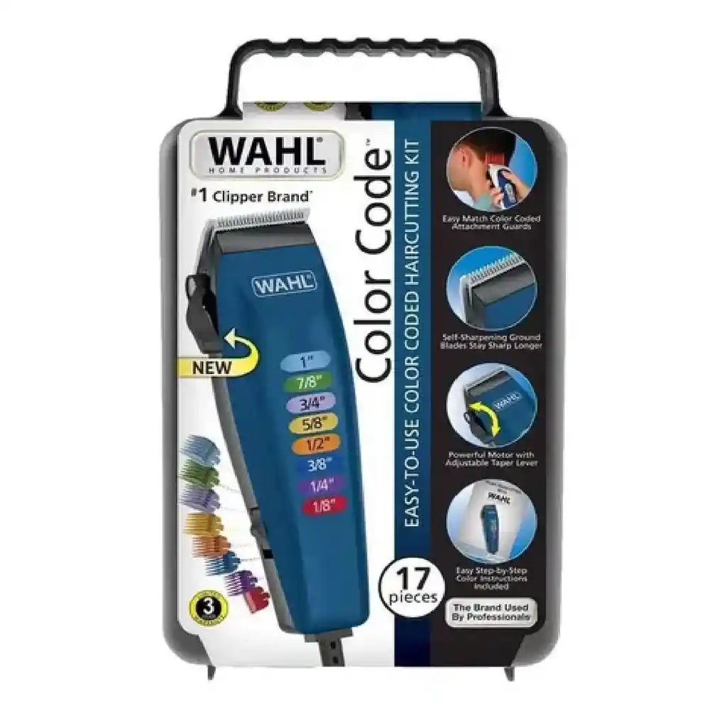 FANTÁSTICA MAQUINA DE PELUQUERIA CORTE DE CABELLO WAHL COLOR CODE 100% ORIGINAL, 17 PIEZAS Peines guía con códigos de color y una tabla de colores en la cortadora que le permite elegir el corte correcto con rapidez y facilidad. Contenido del kit Cortadora de un solo corte Protector de cuchilla Funda blanda Peine mediano Tijeras Cepillo de limpieza Aceite de cuchilla 10 peines guía (3, 6, 10, 13, 16, 19, 22, 25mm Guía de oreja izquierda y guía de oreja derecha