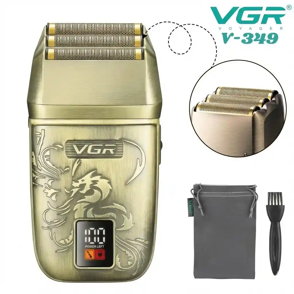 Maquina Rasuradora De Afeitar Shaver Vgr V-349 Esta es una máquina de afeitar eléctrica V-349. Presenta un diseño distintivo y elegante con un acabado en color dorado antiguo, diseñada para ofrecer una experiencia de afeitado apurado y cómodo, combinando estética con funcionalidad. Características: - Sistema de Cuchillas: La rasuradora cuenta con tres láminas de afeitado independientes con un diseño de malla perforada. Estas láminas están diseñadas para capturar y cortar el vello de manera eficiente mientras protegen la piel de cortes e irritaciones. - Pantalla Digital LED: Incorpora una pantalla digital LED. - Diseño Ergonómico: El cuerpo tiene una forma ergonómica que sugiere un agarre cómodo. Paquete Incluye: - Bolsa de Almacenamiento: Bolsa de transporte de tela para proteger la afeitadora durante viajes o para su almacenamiento. - Cepillo de Limpieza: Cepillo de limpieza para eliminar los restos de vello de los cabezales de afeitado.