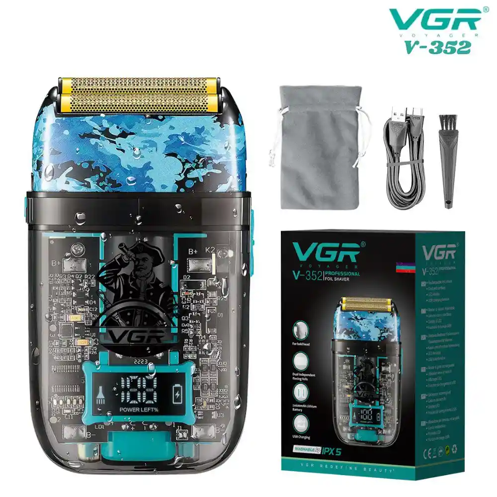 Maquina Rasuradora De Afeitar Shaver Vgr V-352. Esta afeitadora recargable combina tecnología avanzada con un diseño práctico y elegante. Ideal tanto para el rostro como para la cabeza, ofrece un rendimiento potente y una experiencia de uso superior, ya sea en casa o mientras viajas. Su motor de alta velocidad la convierten en una herramienta indispensable para el cuidado diario. Características: - Es una afeitadora recargable diseñada para un afeitado a ras, ideal tanto para la cabeza como para la barba. - Cuenta con doble lámina flotante de acero inoxidable que se adapta al contorno del rostro para un afeitado preciso. - Batería y Autonomía: Está equipada con una batería de iones de litio de doble celda (2x600 mAh). Ofrece un tiempo de funcionamiento de 120 minutos continuos tras un tiempo de carga de solo 2 horas. - Pantalla LED: Incorpora una pantalla digital que muestra claramente el porcentaje de batería restante, permitiendo un control exacto de la carga. - Sistema de Carga USB: Ofrece un rendimiento duradero y potente. Se recarga de manera universal y rápida a través de su cable USB incluido. Especificaciones: -Modelo: Vgr V-352 -Tiempo de trabajo: 1200 minutos -Tiempo de carga: 2 Hrs -Material de la hoja: acero inoxidable -Método de limpieza: limpieza con cepillo -Cargador: USB