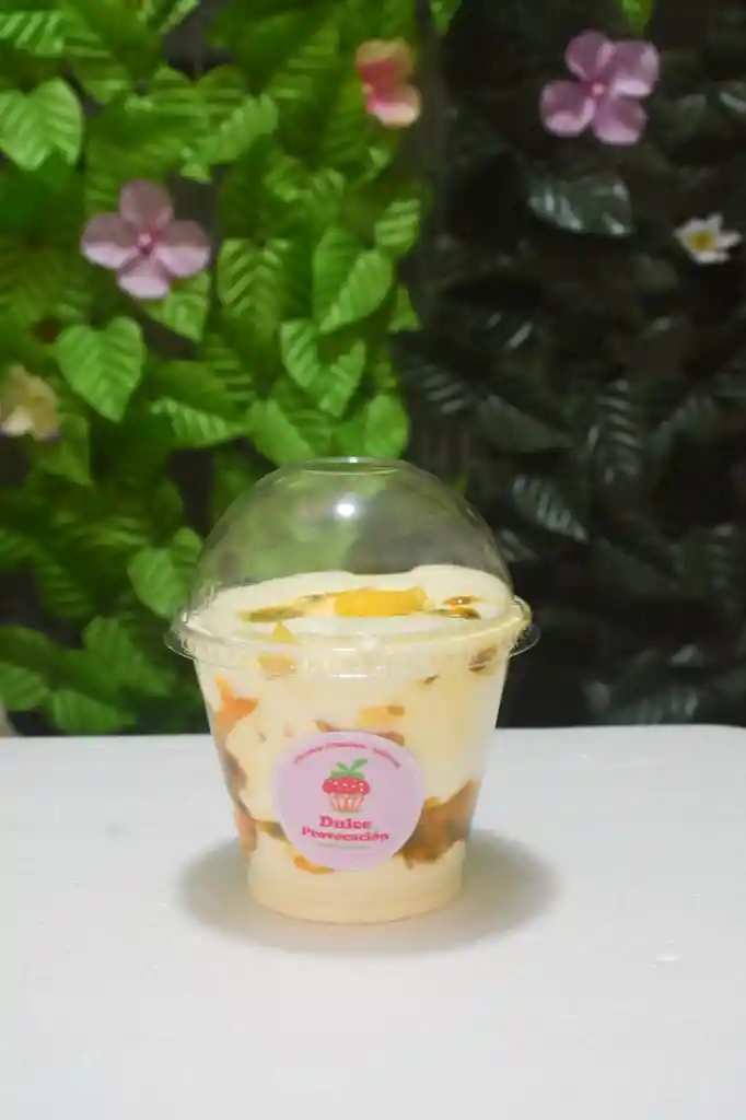 Postre en capas elaborado con crema de la casa tipo chantilly, mango fresco y maracuyá y/o gulupa fresca. Las capas se repiten varias veces, logrando una mezcla equilibrada entre dulce y ácido. Producto fresco, listo para consumir. Ideal como postre individual.