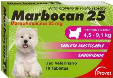 Marbocan® 50 Marbocan® 25 es una línea de productos antimicrobianos de amplio espectro que contiene marbofloxacina, una fluoroquinolona de tercera generación que ejerce acción bactericida en microorganismos susceptibles asociados a procesos infeciosos. INDICACIONES: Marbocan® 50 Marbocan® 25 es una línea de productos antimicrobianos orales indicados en perros y gatos para el tratamiento de infecciones ocasionadas por agentes susceptibles a la marbofloxacina. Principalmente para el tratamiento de infecciones de piel, tracto genitourinario, tejidos blandos y tracto respiratorio alto, ocasionadas por bacterias Gram-positivas (Bacillus spp, Corynebacterium spp, Staphylococcus aureus, Staphylococcus intermedius, Streptococcus Beta-hemolítico), Gram-negativas (Actinobacillus Bordetella bronchiseptica, Brucella canis, Escherichia coli, Haemophilus spp, Klebsiella pneumoniae, Moraxella spp, Morganella morganii, Pasteurella multocida, Proteus spp, Pseudomonas aeruginosa, Salmonella spp, Serratia marcescens, Shigella spp) Mycoplasma spp.