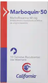 MARBOQUIN es un antibiótico de acción prolongada Composición Contenido Marbofloxacina 50 mg ACCIÓN: Antimicrobiano DOSIS: Perros: En infecciones respiratorias, el tratamiento es al menos 7 días y dependiendo de la evolución hasta por 21 días. Infecciones de piel y tejidos blandos, el tratamiento es al menos por 5 días y dependiendo de la evolución hasta por 40 días. En infecciones del tracto urinario, el tratamiento es al menos 10 días dependiendo de la evolución hasta por 28 días. Gatos: Para infecciones del tracto respiratorio alto la duración es de 5 días. Infecciones de piel y tejidos blandos (heridas, abscesos) la duración del tratamiento es de 3 a 5 días.